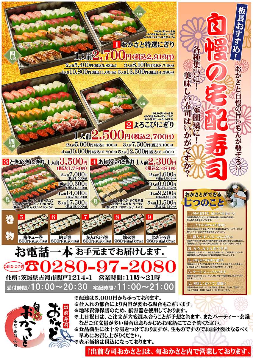 - 20人前以上のご注文は、なるべく前日迄にご予約ください。